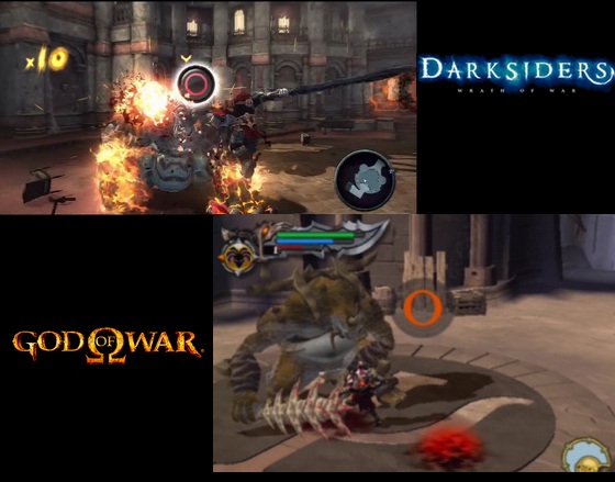 Muchos de los movimientos innatos en Kratos están presentes en el repertorio del Jinete: atacar cuando se está escalando, mientras se cuelga de una soga o de un techo; la habilidad de saltar nuevamente en el aire (Air jump), realizar combos impresionantes alternando distintas armas (ni hablar de los combos aéreos) y las barreras rojas y azules que son infaltables (que ya en God of War venían heredadas de Devil May Cry). Al igual que el espartano, Guerra es movido por la ira y la venganza y esto se refleja claramente en la forma de exterminar a sus rivales, mediante aniquilaciones terribles y despiadadas (aunque se echa de menos los Quick Time Events). Enemigos monumentales, mejoras para las armas, recolección de almas (orbes), armas de corto y largo alcance, lanzamiento de hechizos, desmembramientos especiales, muchos son los factores de similitud con God of War. No en vano algunos críticos lo consideraron como una copia burda y por ende no le dieron la consideración que se merecía.