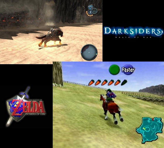 En un momento dado de la aventura nos otorgaran la habilidad de montar en nuestro fiel corcel “Ruina”, del mismo modo que Link monta a Epona en Ocarina of Time y los demás juegos donde hace su aparición. Otro aspecto que se comparte en ambos juegos, es el sistema de la aceleración: si recuerdan, cuando se montaba a Epona se visualizaba en la parte superior una barra con seis zanahorias que representaban las aceleraciones que se podían realizar. A medida que se utilizaban se iban consumiendo y la manera de reponerlas era esperando un breve periodo de tiempo sin acelerar. En Darksiders sucede lo mismo, con la excepción de que en este caso es una barra de fatiga, conformada por cinco unidades, que permiten a Ruina ser más veloz durante unos pocos segundos.
