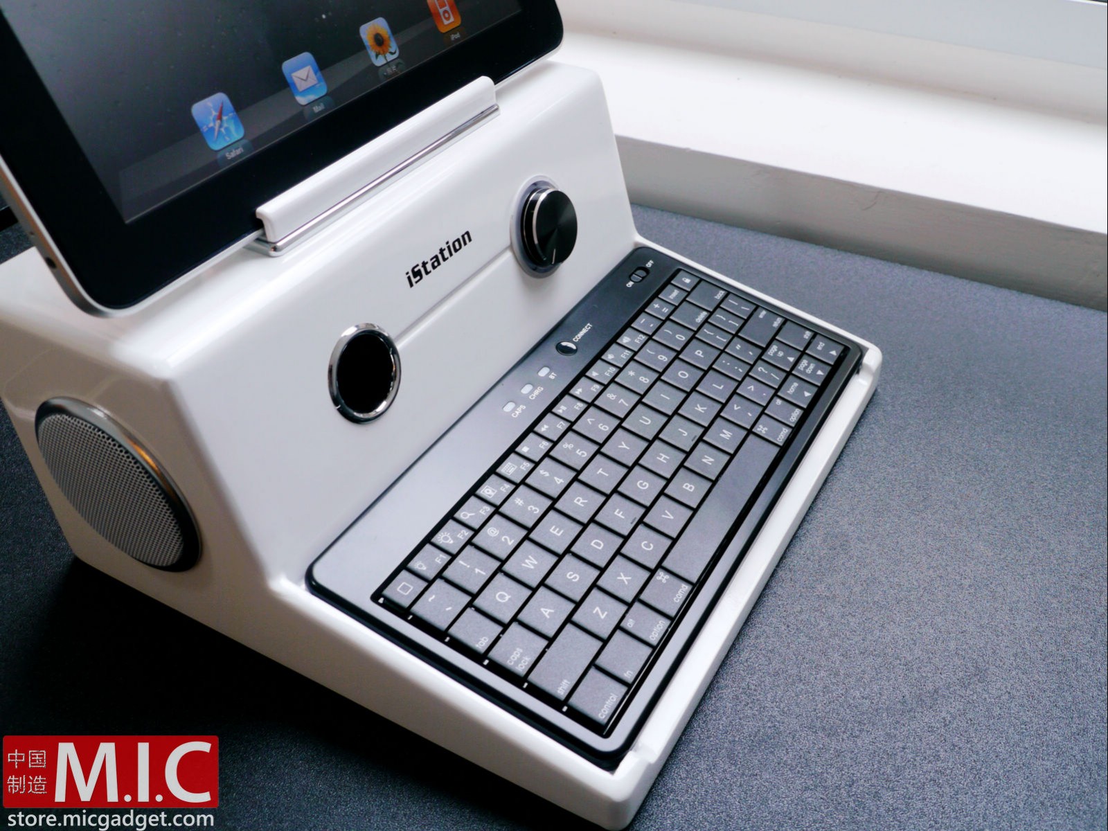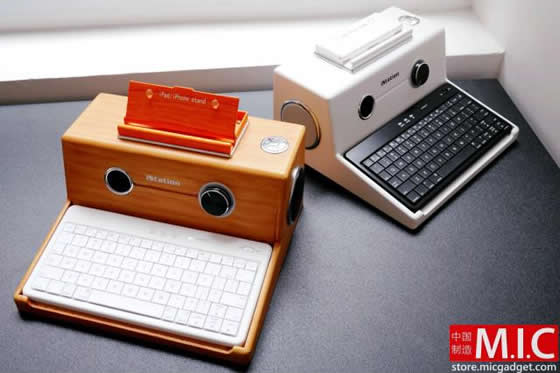 Se trata de un complemento divertido y algo aparatoso, quizá sólo recomendado para aquellos que tengan muy claro que van a escribir muchas veces en el mismo lugar. Cuesta unos 86$ y además de incluir un teclado bluetooth inalámbrico (con disposición americana) dispone de altavoces en los que puede reproducir música directamente desde un pendrive (para ello cuenta con un puerto usb) o de una entrada de audio (jack de 3.5).