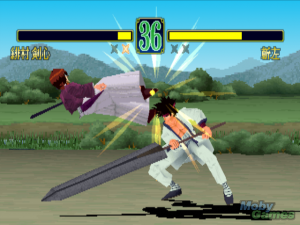 El primer videojuego basado en esta serie apareció justo cuando el anime se estaba haciendo popular en Japón, por lo cual sólo abarca los 7 primeros tomos del manga original. Se trata de un arcade de lucha 3D al estilo Tekken, tan populares a mitad de los ’90, programado por Zoom Inc. responsable de la controvertida saga Zero Divide. El principal problema del juego es que posee un engine bastante pobre y aunque se deja jugar, sin más, luce unos modelos poligonales bastante justitos y una cantidad de movimientos por personajes sumamente limitada. Aun así, la ilusión nos pudo por ser la primera vez que podíamos controlar a Kenshin en un videojuego. El modo historia, precedido por unas vistosas escenas anime, nos pone en la piel del protagonista, que deberá enfrentarse a Sannosuke y su gigantesca Zanbatou, que después de ser derrotado se unirá a nosotros, pudiendo cambiar de personaje antes del combate. Una vez el equipo está completo, deberemos enfrentarnos a Jinn-e Udo y al Oniwabanshu (Hyottoko, Shikijo y Han’nya) liderado por Aoshi Shinomori, que hace las veces de enemigo final -y que es mi personaje preferido de la serie, como muchos habréis podido deducir-.