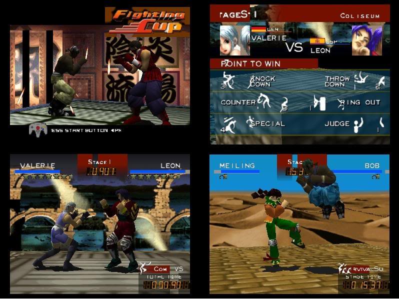 Conocido como Fighting Cup en Japón, este juego abría lo que sería la única saga de juegos de pelea exclusiva para la maltratada -en este aspecto- consola de 64 bits Nintendo. Este cartucho de 96 megas era bastante correcto en todos los aspectos: gráficos genéricos en 3D, música decente, jugabilidad correcta… Su principal innovación era el sistema de combate, ya que no teníamos que liquidar la barra de energía del oponente como es habitual, sino que teníamos que sumar puntos, que se conseguían noqueando al oponente, lanzándole al suelo con una llave o mandándole fuera del ring. Este curioso sistema maquillaba lo que realmente era este juego: una copia más de Virtua Fighter. Aun así era una buena alternativa para los poseedores de una N64, debido al pobre catálogo de la consola en este género. El elenco de personajes también era de lo más típico y tópico: teníamos al prota japonés al uso, al luchador de wrestling habitual, la luchadora china que no puede faltar, el inevitable payaso… Y así hasta completar un plantel de nueve luchadores. En Fighter’s Destiny todo huele a «visto anteriormente», pero aun así es de lo mejorcito en juegos de lucha para esta consola.