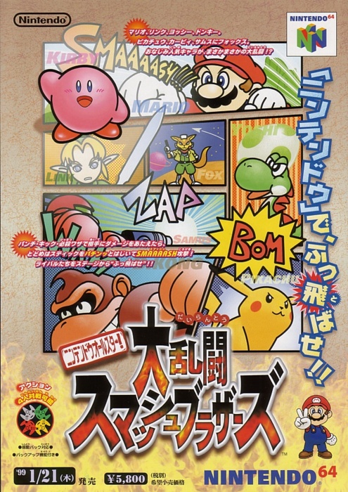 Tenía que ser la propia Nintendo la que llegara y se plantara con el mejor juego de peleas para la consola de Nintendo. En realidad hacía tiempo que en la Gran N habían tenido la idea de reunir a sus personajes más famosos en un arcade de lucha, pero no se acababan de decidir porque algunos altos cargos de Nintendo creían que las franquicias de la compañía no encajaban en un violento juego de darse tortas. Al final se dejaron de paparruchas y lanzaron este estupendo juego que, al contrario que Tekken o Street Fighter, no requiere memorizar los ataques especiales, ya que solo usa un botón de ataque, que sin embargo permite hacer varias combinaciones de golpes sencillas y efectivas. El juego, además, tiene un modo multiplayer increiblemente divertido, de hasta 4 jugadores, además de una jugabilidad a prueba de bombas Made in Nintendo. Los ocho personales disponibles inicialmente son Mario (Super Mario Bros.), Link (The Legend of Zelda), Samus (Metroid), Pikachu (Pokémon), Fox (Star Fox), Kirby (Kirby’s Dream Land), Donkey Kong (ídem) y Yoshi (Super Mario World). Hay 4 personajes desbloqueables: Captain Falcon (F-Zero), Luigi, Ness (Earthbound-Mother) y Jigglypuff, quedando representadas la gran mayoría de sagas de Nintendo. Sin duda, el nacimiento de una divertidísima saga.